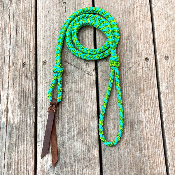 8 strand braided over under made from the highest quality nylon 550 paracord. This over under had an adjustable handle to attach to your saddle horn or wrist and finished with a leather popper!