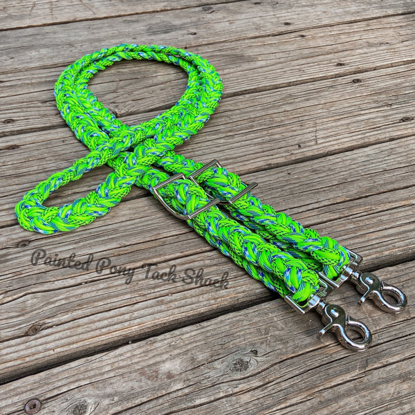9 strand braided reins made from the highest quality nylon 550 paracord. These reins are adjustable with conways and attach to your bit with trigger snaps!