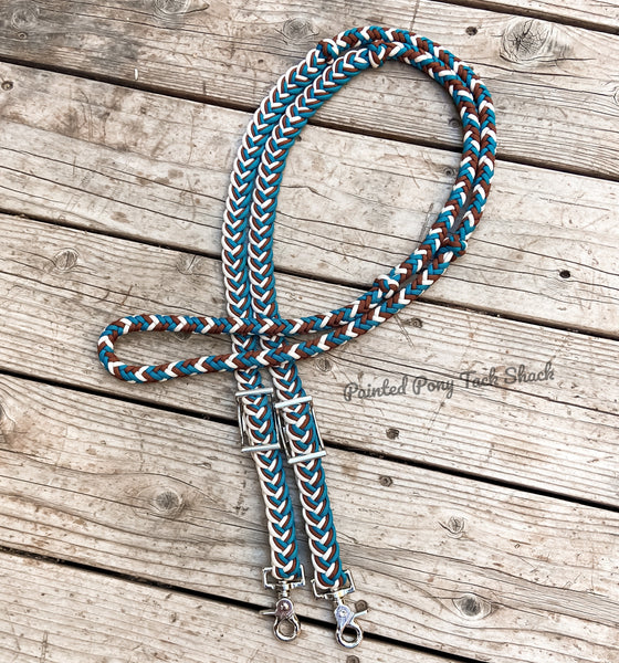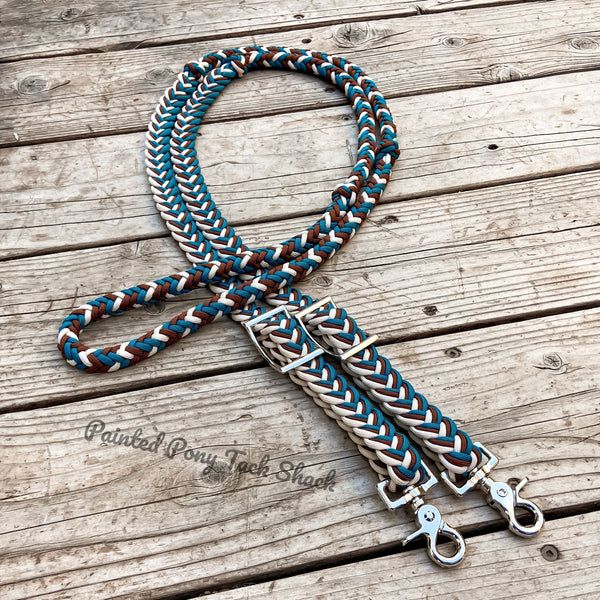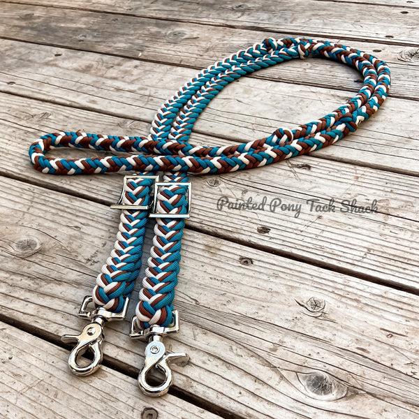 9 strand braided reins made from the highest quality nylon 550 paracord. These reins are adjustable with conways and attach to your bit with trigger snaps!
