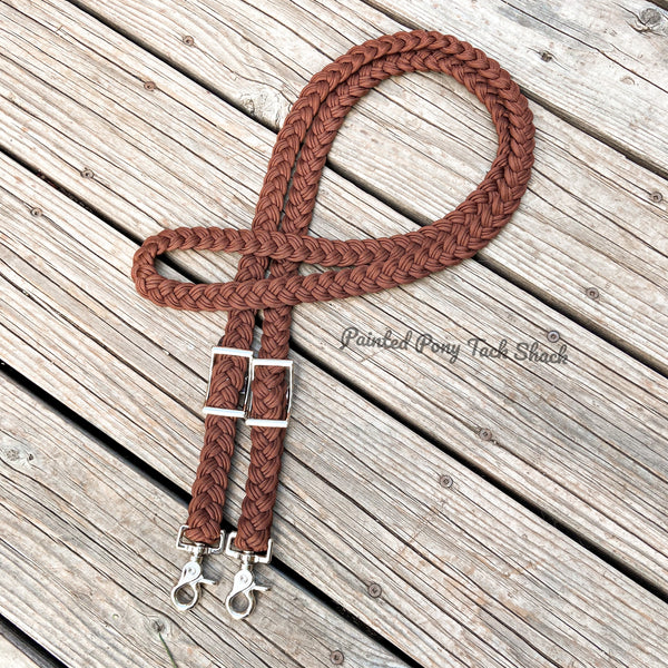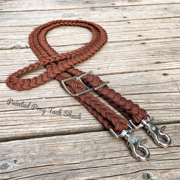9 strand braided reins made from the highest quality nylon 550 paracord. These reins are adjustable with conways and attach to your bit with trigger snaps!