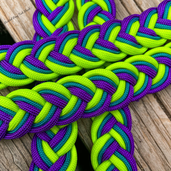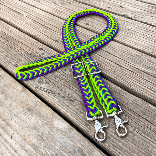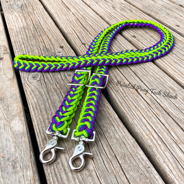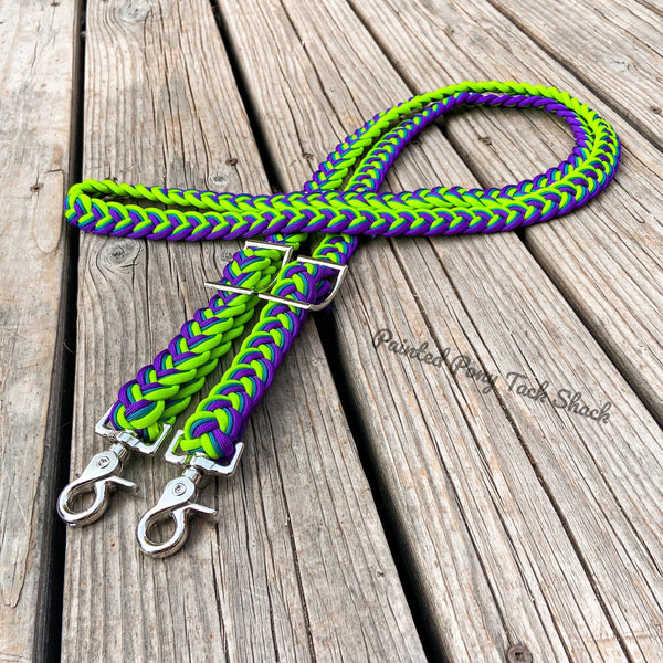 9 strand braided reins made from the highest quality nylon 550 paracord. These reins are adjustable with conways and attach to your bit with trigger snaps!
