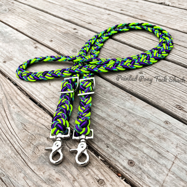 9 strand braided reins made from the highest quality nylon 550 paracord. These reins are adjustable with conways and attach to your bit with trigger snaps!