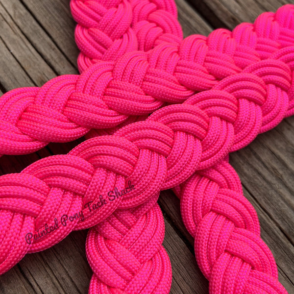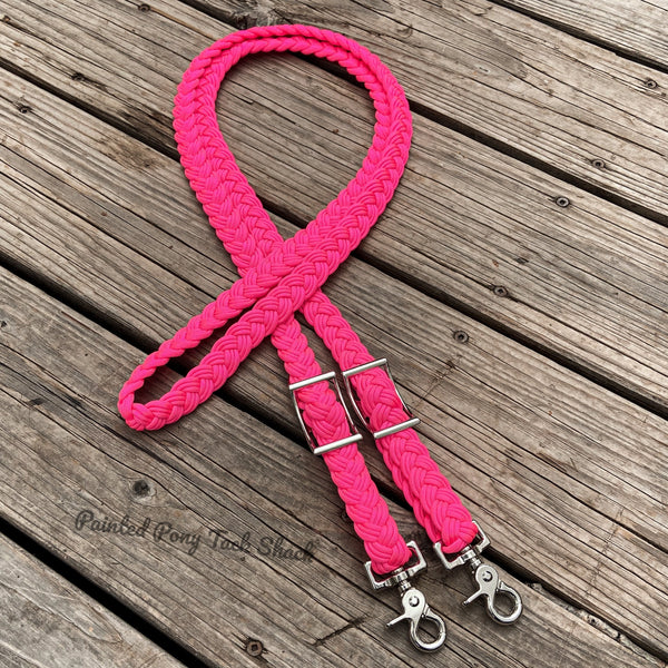 9 strand braided reins made from the highest quality nylon 550 paracord. These reins are adjustable with conways and attach to your bit with trigger snaps!