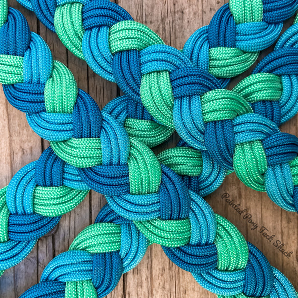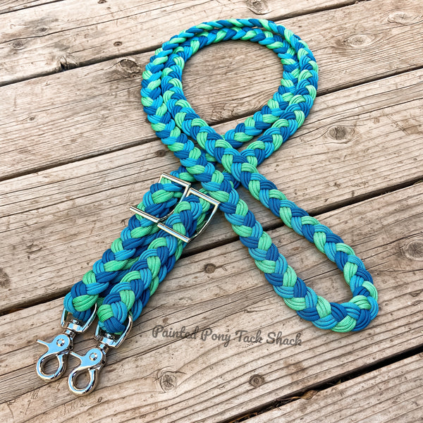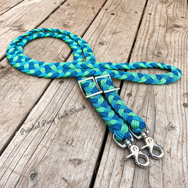 9 strand braided reins made from the highest quality nylon 550 paracord. These reins are adjustable with conways and attach to your bit with trigger snaps!