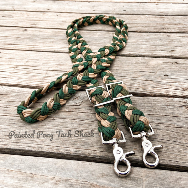 9 strand braided reins made from the highest quality nylon 550 paracord. These reins are adjustable with conways and attach to your bit with trigger snaps!