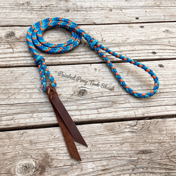 8 strand braided over under made from the highest quality nylon 550 paracord. This over under had an adjustable handle to attach to your saddle horn or wrist and finished with a leather popper!